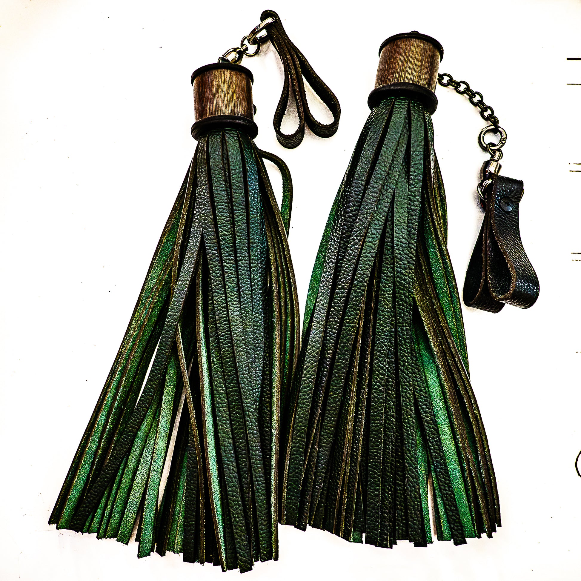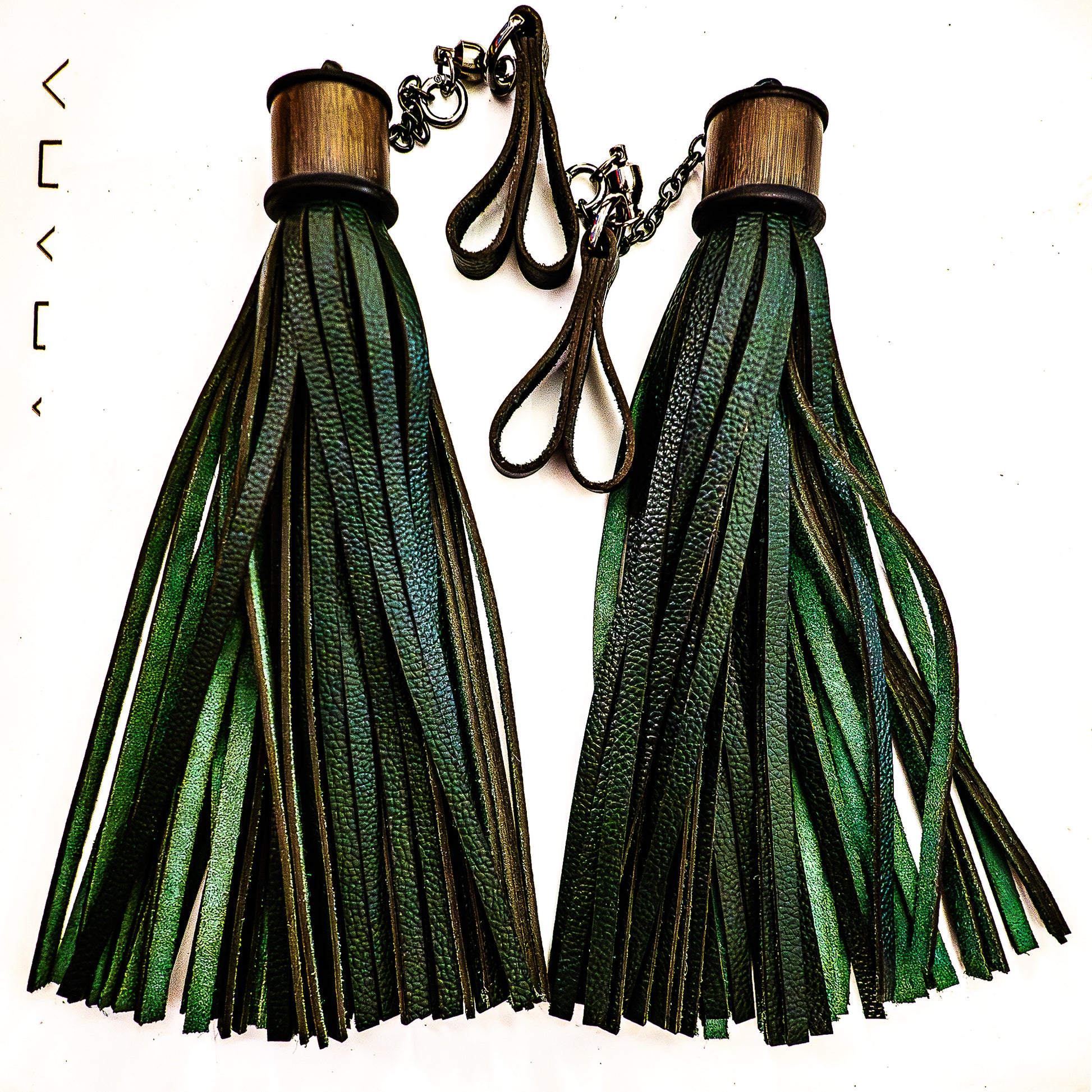 Poi/Fir Green Finger Floggers (pair, each 33cm leather + 25cm finger loops and chain)