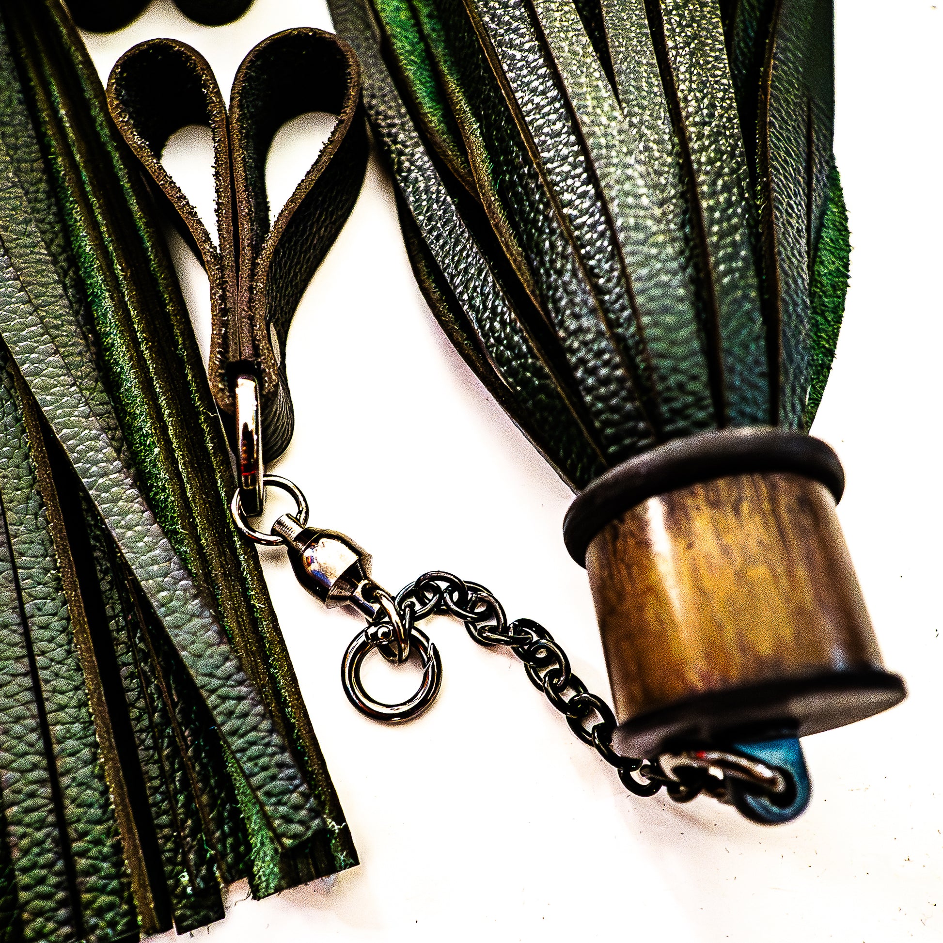 The soft leather finger loops are attached to the floggers via a double ball-bearing swivel joint – extremely smooth and virtually indestructible – and a short stainless steel chain with a carabiner ring. The chain, or even the entire mechanism, is removable, allowing the floggers to be used as handheld floggers as well.