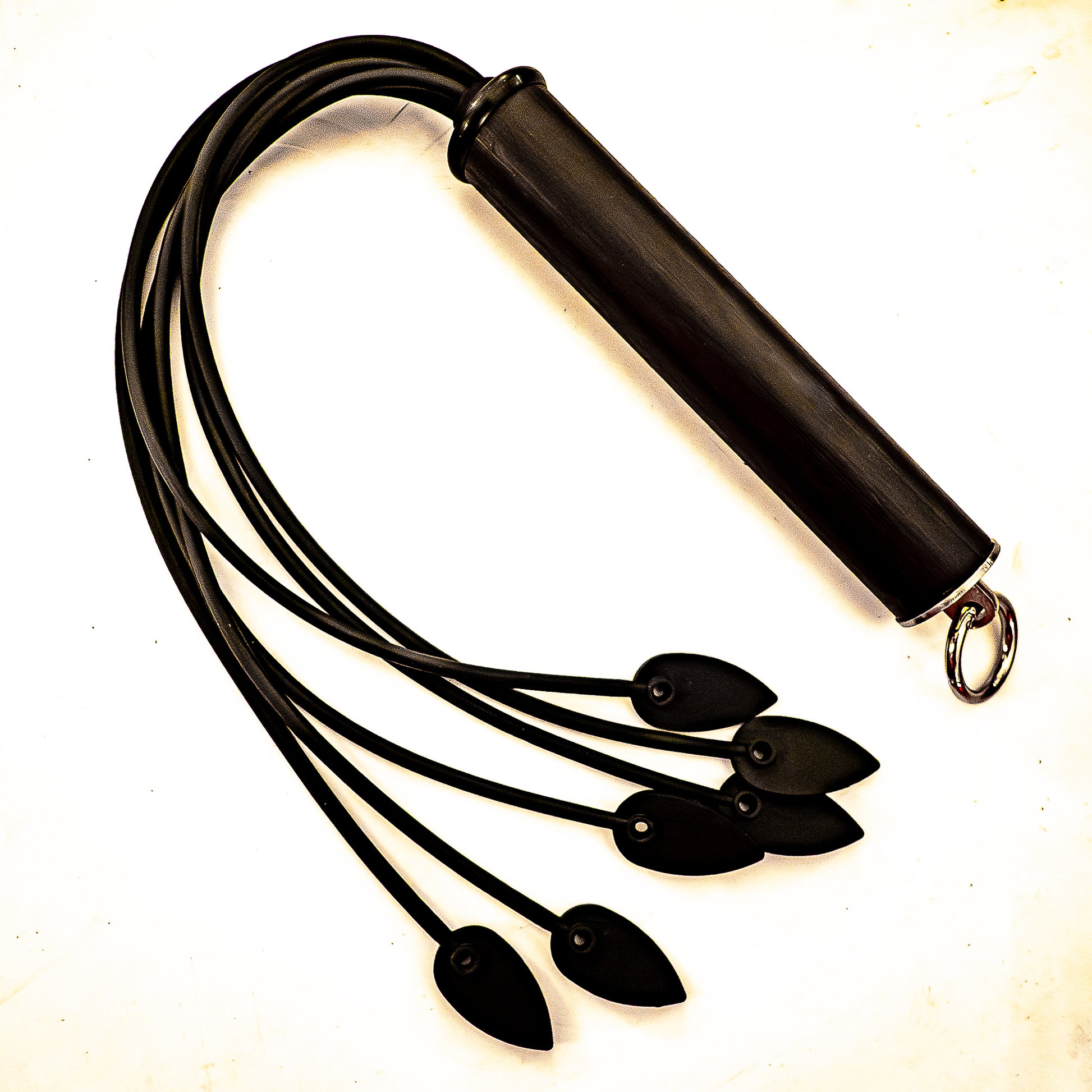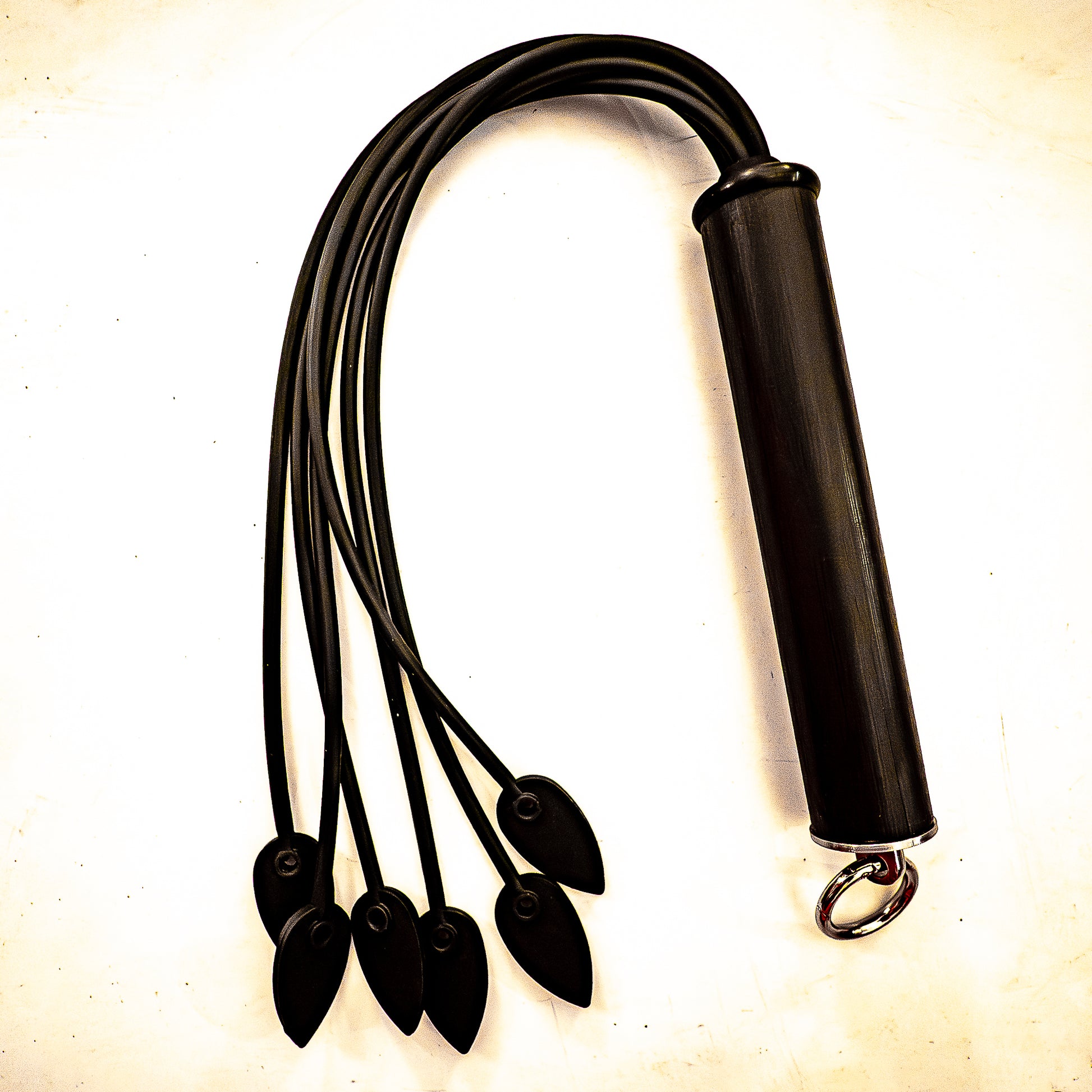 Peitsche mit 6 Strängen aus Silikonkautschuk mit verdicktem, blattförmigem Kopf. Gesamtlänge ca. 61cm/24", davon ca. 17cm/7“ Griff aus individuell gefärbtem Bambusholz, veredelt mit feinstem Lack und mit einem Abschluss aus V2A Edelstahl mit abnehmbarem O-Ring.