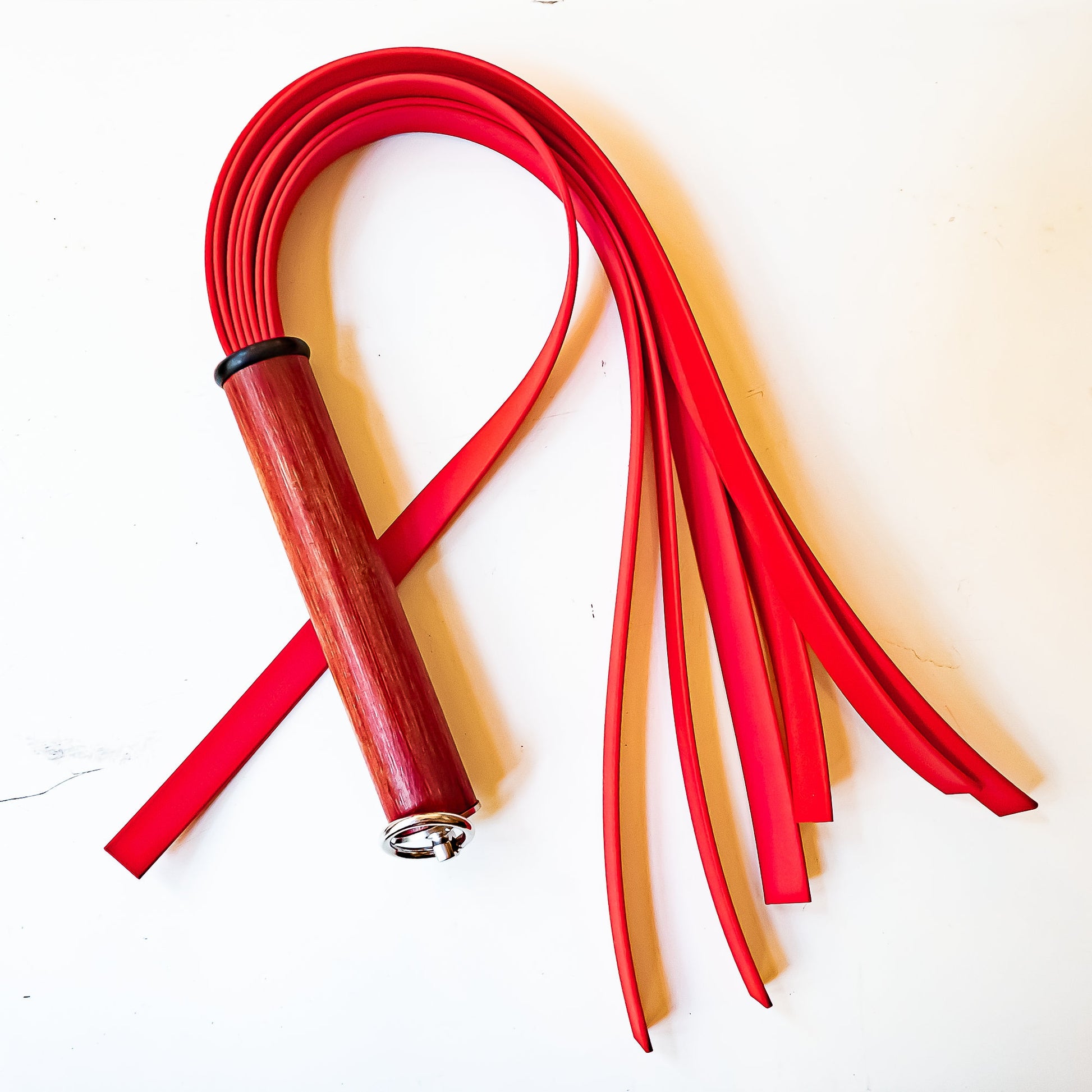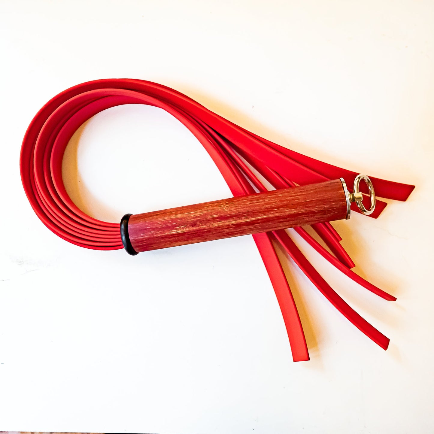 Peitsche mit 7 Stränge aus 16mm breitem und 2,5mm dickem BioThane, einem hochwertigen Gummimaterial verstärkt mit Textilkern, ca. 61cm/24", davon ca. 17cm/7" Griff aus individuell gefärbtem Bambusholz, veredelt mit feinstem Lack und abgeschlossen mit unserem neuen großen O-Ring aus V2A Edelstahl.